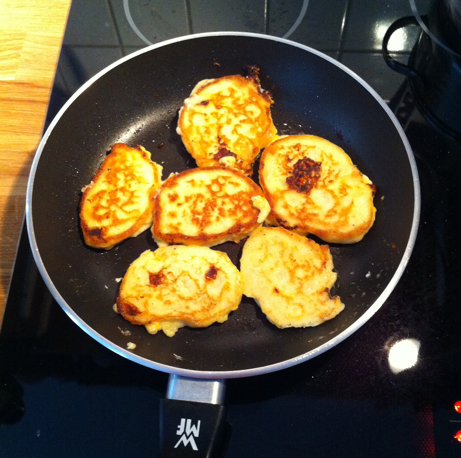 Jetzt kommt auch schon die Pfanne zum Einsatz. Ihr gebt etwas Öl in die Pfanne. Wenn das Öl heiß genug ist, könnt ihr bspw. mit einer Gabel oder einem Löffel kleine Portionen von der entstandenen Masse “abstechen” und in die Pfanne geben. Wenn sich die Masse durch das Anbraten ein wenig verfestigt hat, kommt der Pfannenwender zum Einsatz, denn schließlich sollen die Kartoffelbrei-“Bratlinge” von beiden Seiten schön angebraten und knusprig sein. Oder? ;)