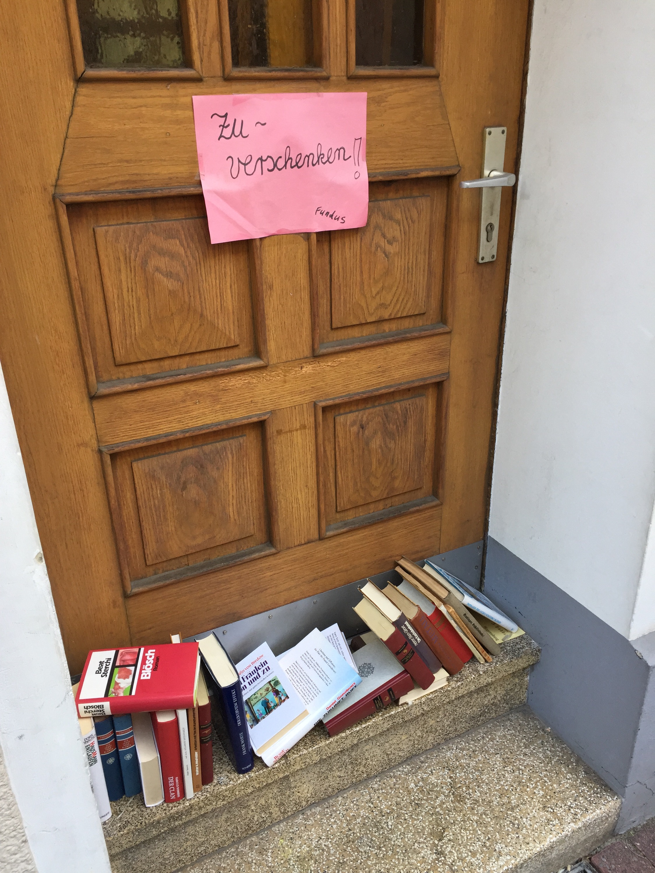 Mein heutiges Foto habe ich heute Morgen in der Ravensberger Straße geschossen. Dort liegen regelmäßig Bücher, die verschenkt werden, auf einer Treppe vor einer Haustür. An der Haustür klebt dann immer ein Zettel, auf dem “Zu verschenken!” steht.